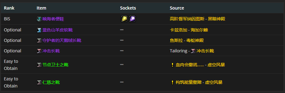 要是选择脚部装备的话,唤海者便鞋是首选。至于附魔嘛,推荐用附魔长靴 - 野猪之速。
