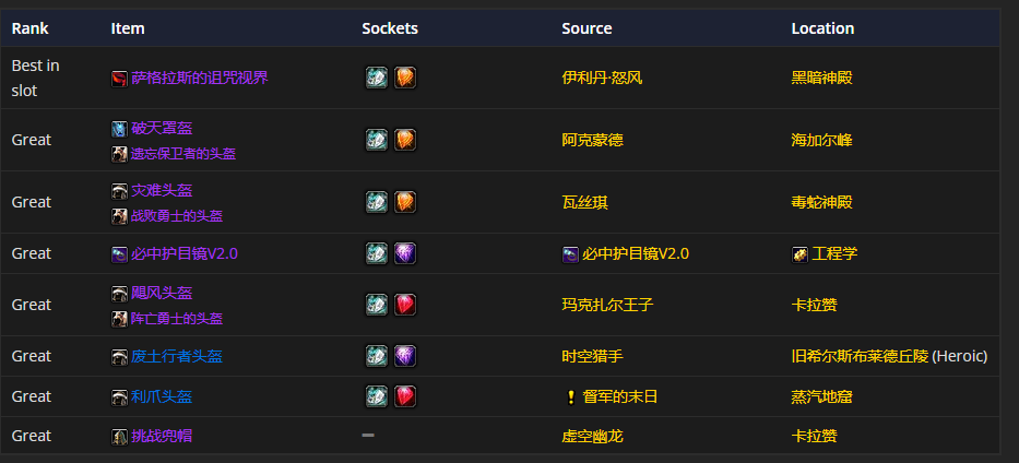 头部装备首选萨格拉斯的诅咒视界,附魔推荐凶暴雕文