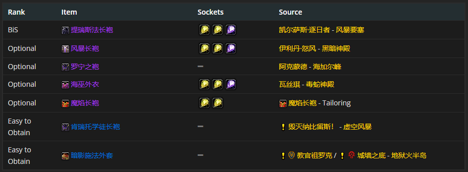 胸部装备的话,首先可以选择提瑞斯法长袍。至于附魔嘛,推荐附魔胸甲 - 杰出属性。