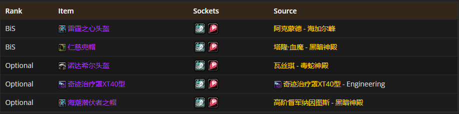 头部装备首选雷霆之心头盔,附魔推荐恢复雕文