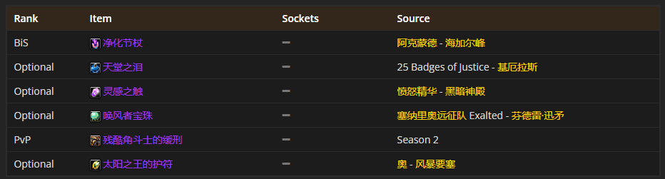 主手的武器呢,就选净化节杖吧。至于附魔嘛,比较推荐附魔武器 - 特效治疗这种。