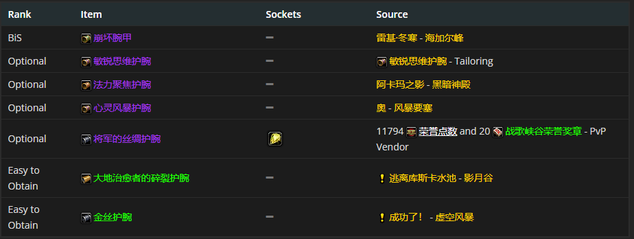 要是挑选手腕装备的话,崩坏护腕是首选。至于附魔嘛,附魔护腕 - 法术能量是比较推荐的。