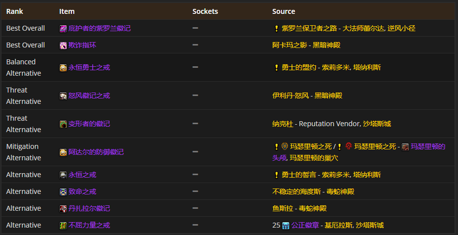 要是挑戒指的话,首先得选庇护者的紫罗兰徽记,还有欺诈指环。至于附魔嘛,比较推荐附魔戒指 - 属性。