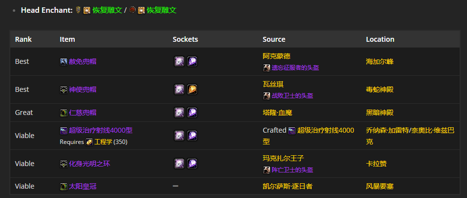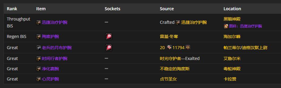 要是选手腕装备的话,那迅捷治疗护腕是首选。而说到附魔的话,附魔护腕 - 超强治疗是比较推荐的。