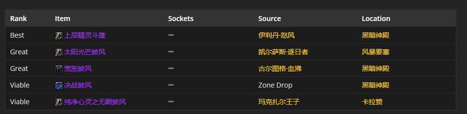 要是挑选披风装备的话,上层精灵斗篷是首选哦。至于附魔嘛,推荐附魔披风 - 狡诈、强效暗影抗性或者特效护甲这几种。