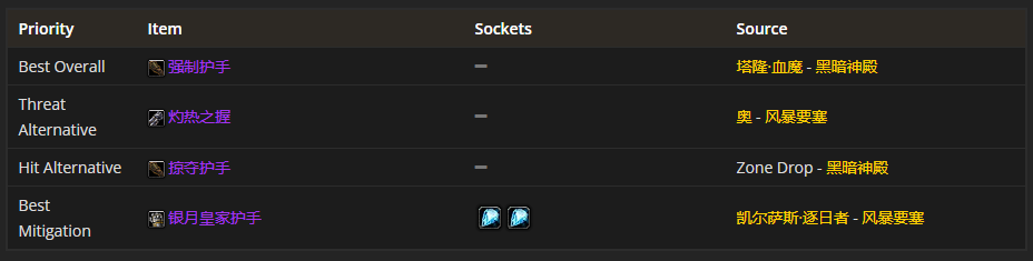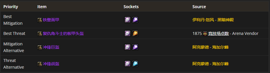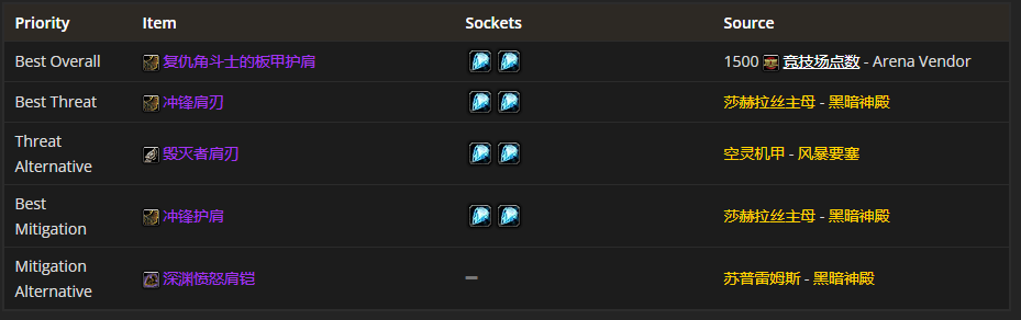如果要选肩部装备的话,复仇角斗士的板甲护肩是首选。而在附魔方面,天灾的坚韧、强力骑士或者护卫铭文是比较推荐的。