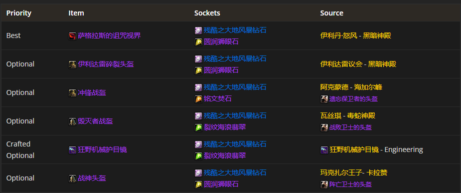 头部装备首选萨格拉斯的诅咒视界,附魔推荐凶暴雕文