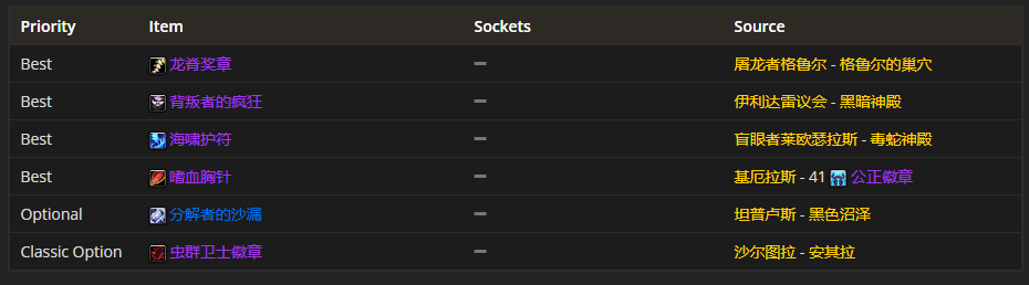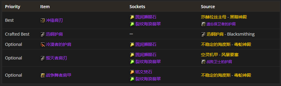 肩部装备首选冲锋肩刃,附魔推荐强力利刃或复仇铭文