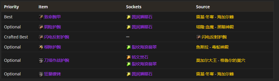 要是挑选手腕装备的话,致命腕甲是首选哦。至于附魔嘛,附魔护腕 - 强壮是比较推荐的。