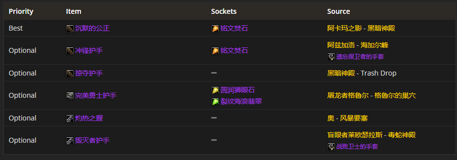 要是选手部装备的话,沉默的公正是首选,至于附魔嘛,推荐附魔手套 - 特效力量。