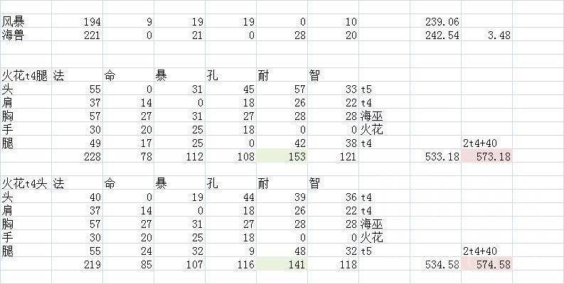 之前有个组合漏掉了,现在补上。这个组合是散件火花海巫,再加上2件T4,当然也有其他搭配的选项。这里面有两种配装情况,一种是T4的头和肩加上海巫火花,这种搭配在某些属性上超过第一种了。不过呢,它比第一种配装少了80点耐力,只是多了相当于1点法强的属性。这真的划算吗?
